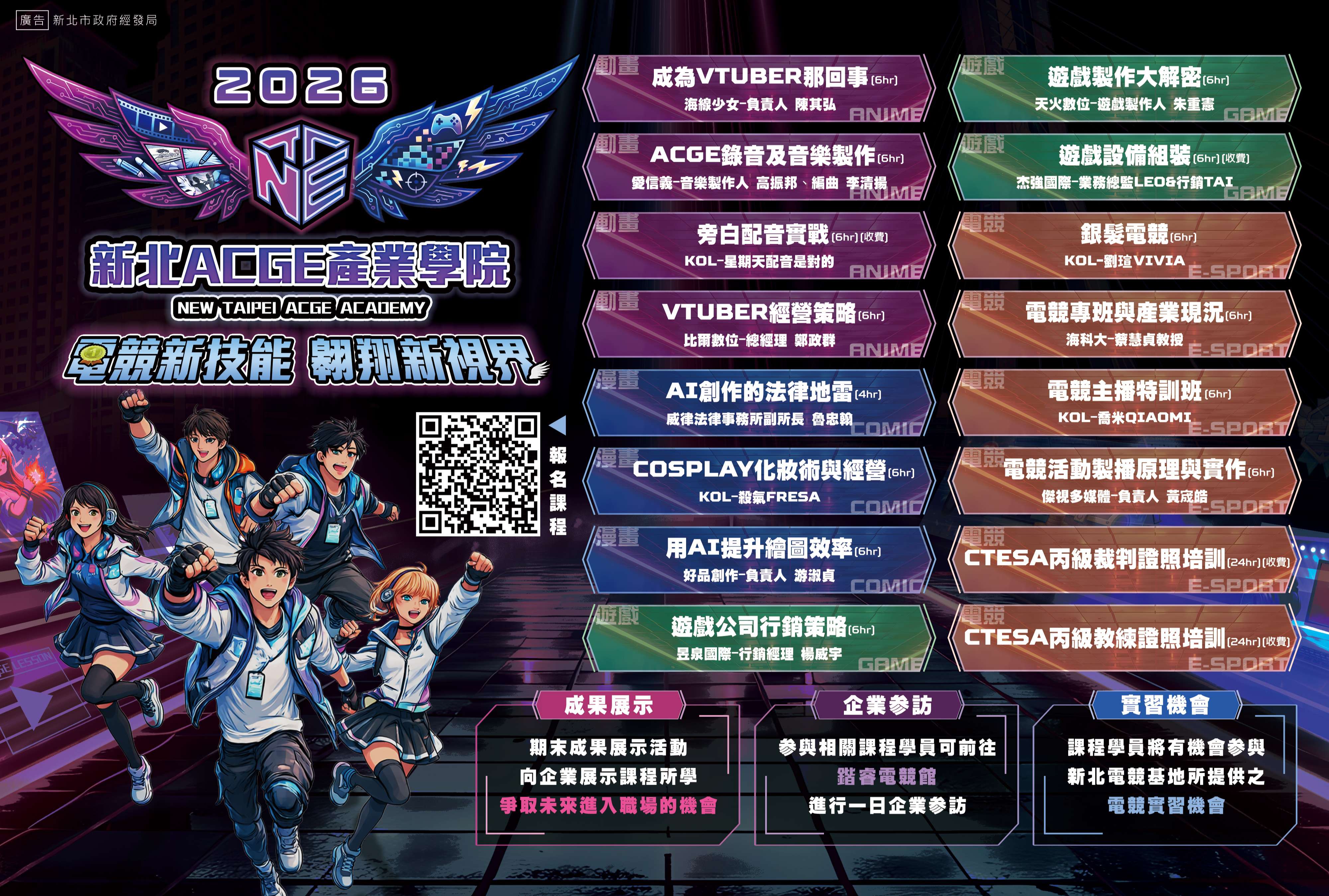 為推動電競產業發展,該局自107年起成立「新北電競基地」(新北市三重區重新路一段87號3樓),並持續辦理電競產業人才培育課程。今(115)年將於3月開辦「新北ACGE產業學院」,涵蓋A(Animation,動畫)、C(Comic,漫畫)、G(Game,遊戲)及E(ESports,電競)四大類別,共16個主題課程,分別開設「基礎班」及「進階班」,以實務導向課程設計與專業分流培訓為核心,邀集產業講師、內容創作者及專業職人共同授課,透過專業課程安排與實作學習模式,協助學員深化專業技能、強化職涯發展即戰力。
