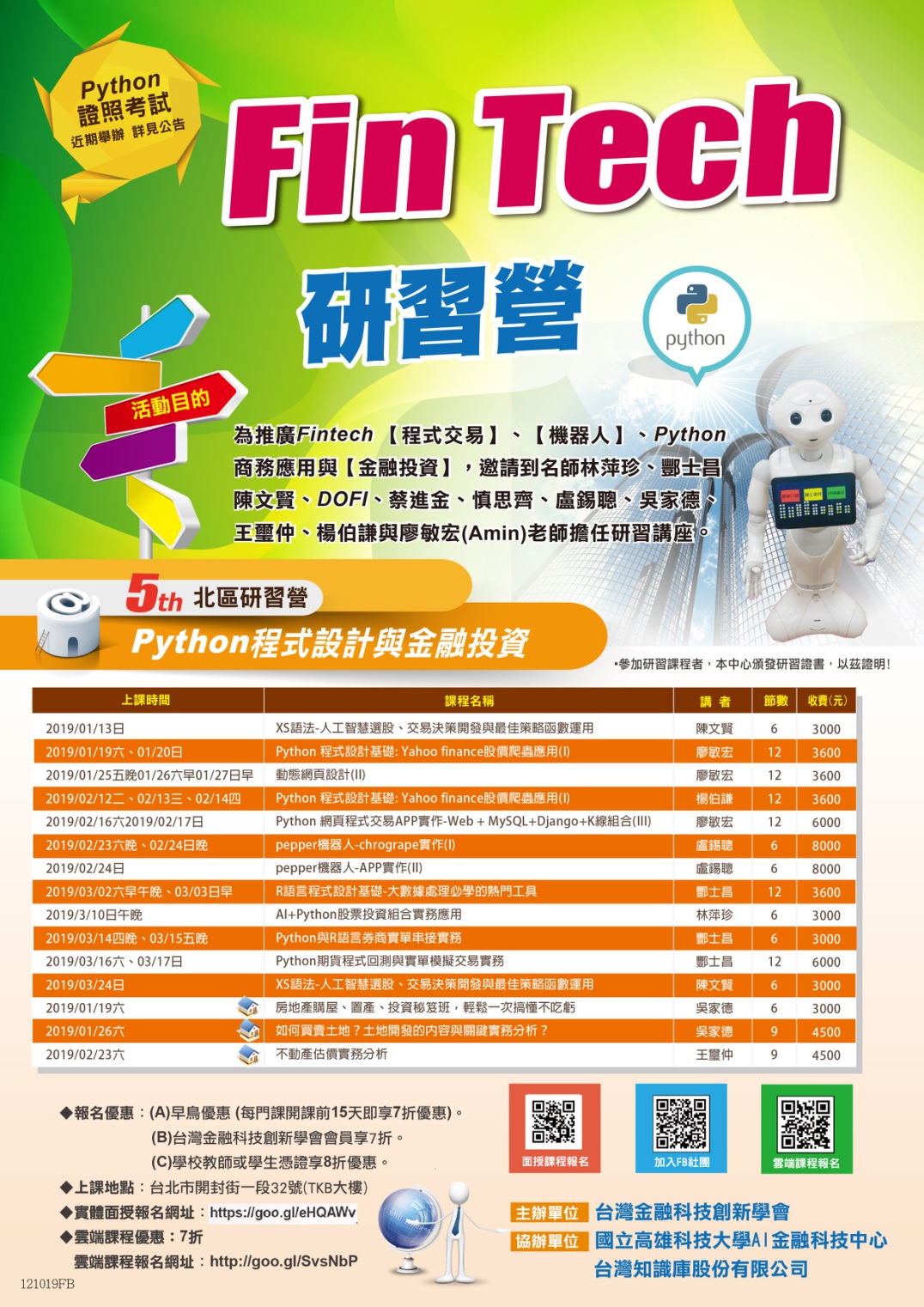 主旨:本校AI金融科技中心「第五梯fintech研習營」研習資訊,敬請惠予公告並鼓勵貴校教師及學生踴躍報名參加,請查照。