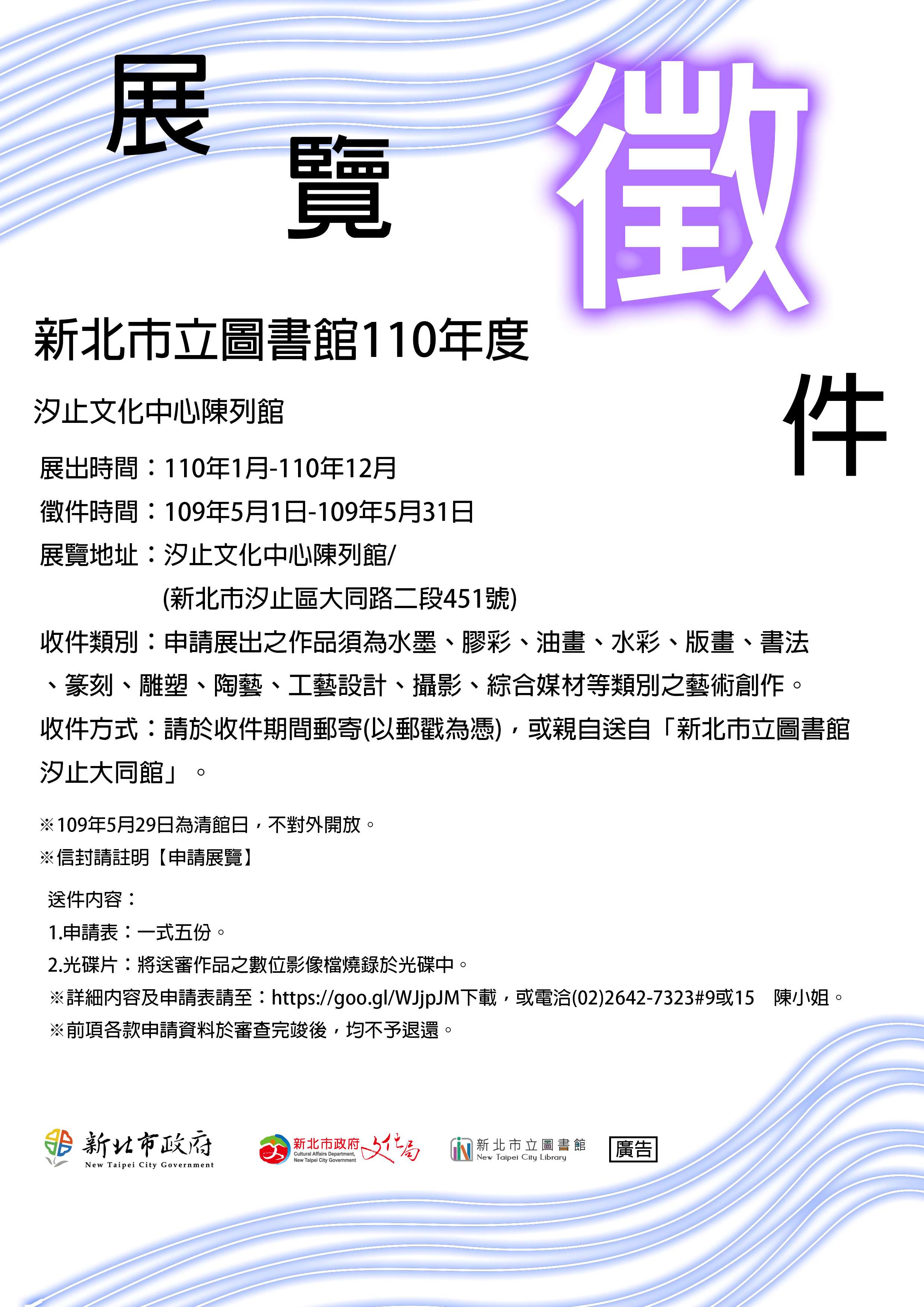 轉知「汐止文化中心陳列館110年美術展覽」徵件申請表及DM各1份。