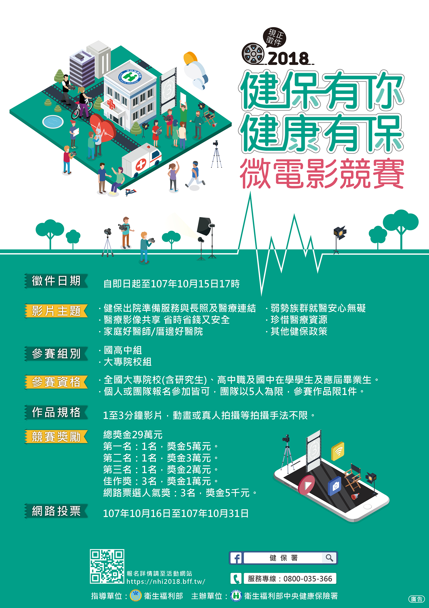 一、為促進大眾對健保的認同及認知度,期透過年輕族群的角度,將健保特色和情感訴求,及對未來健保改革之期待,經由微電影來傳達並感動人心,以提升全民對健保的瞭解及強化珍惜醫療資源之必要性及重要性,特辦理旨揭微電影競賽。
