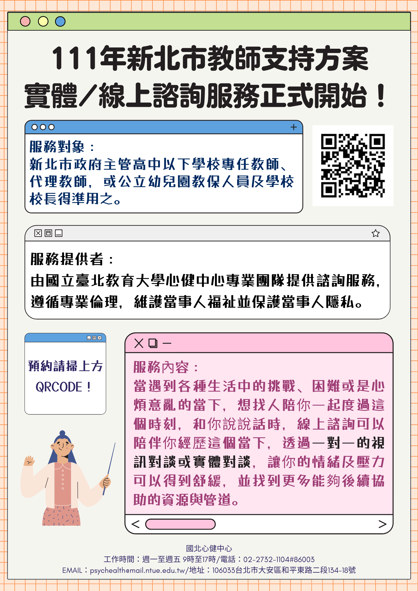二、為促進與維護本市高級中等以下學校教師心理健康,協助教育現場第一線工作教師們排解工作及生活壓力,提供諮商、諮詢及支持服務,透過心理師及專業人員陪伴教師,