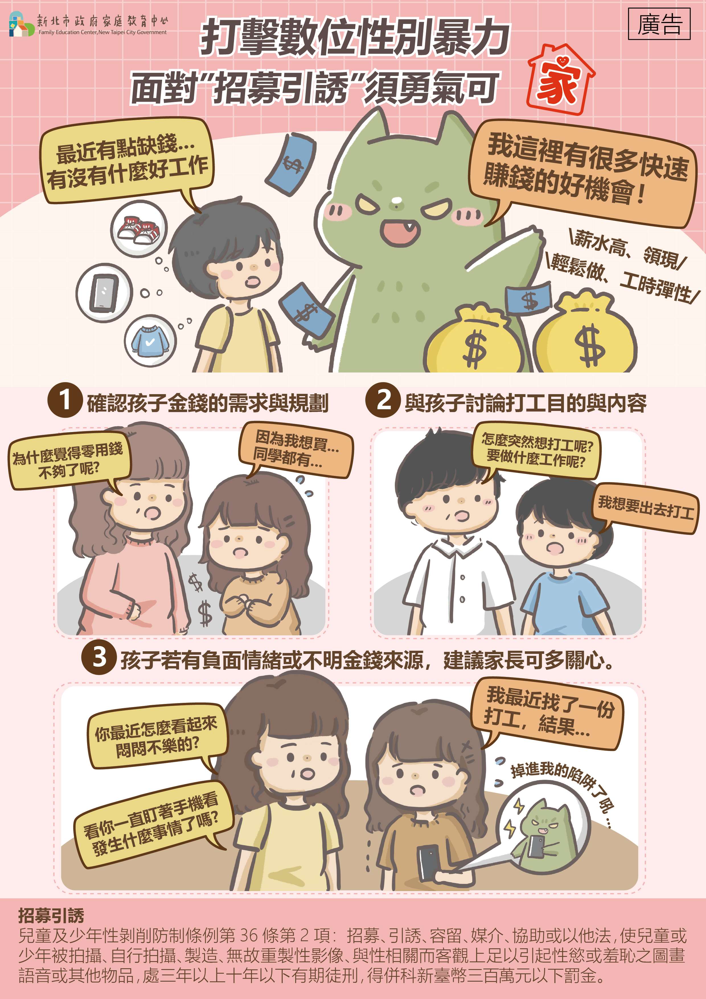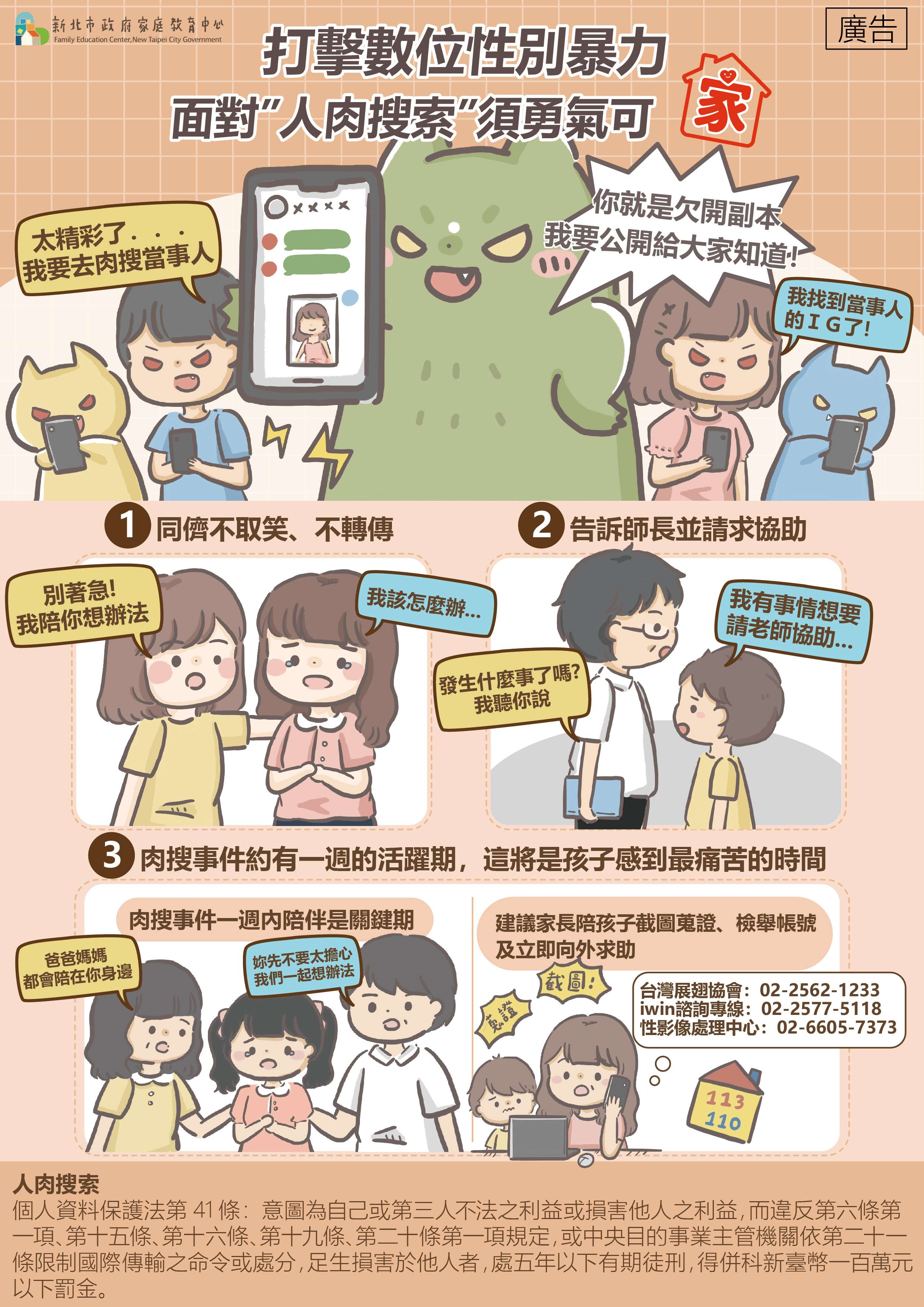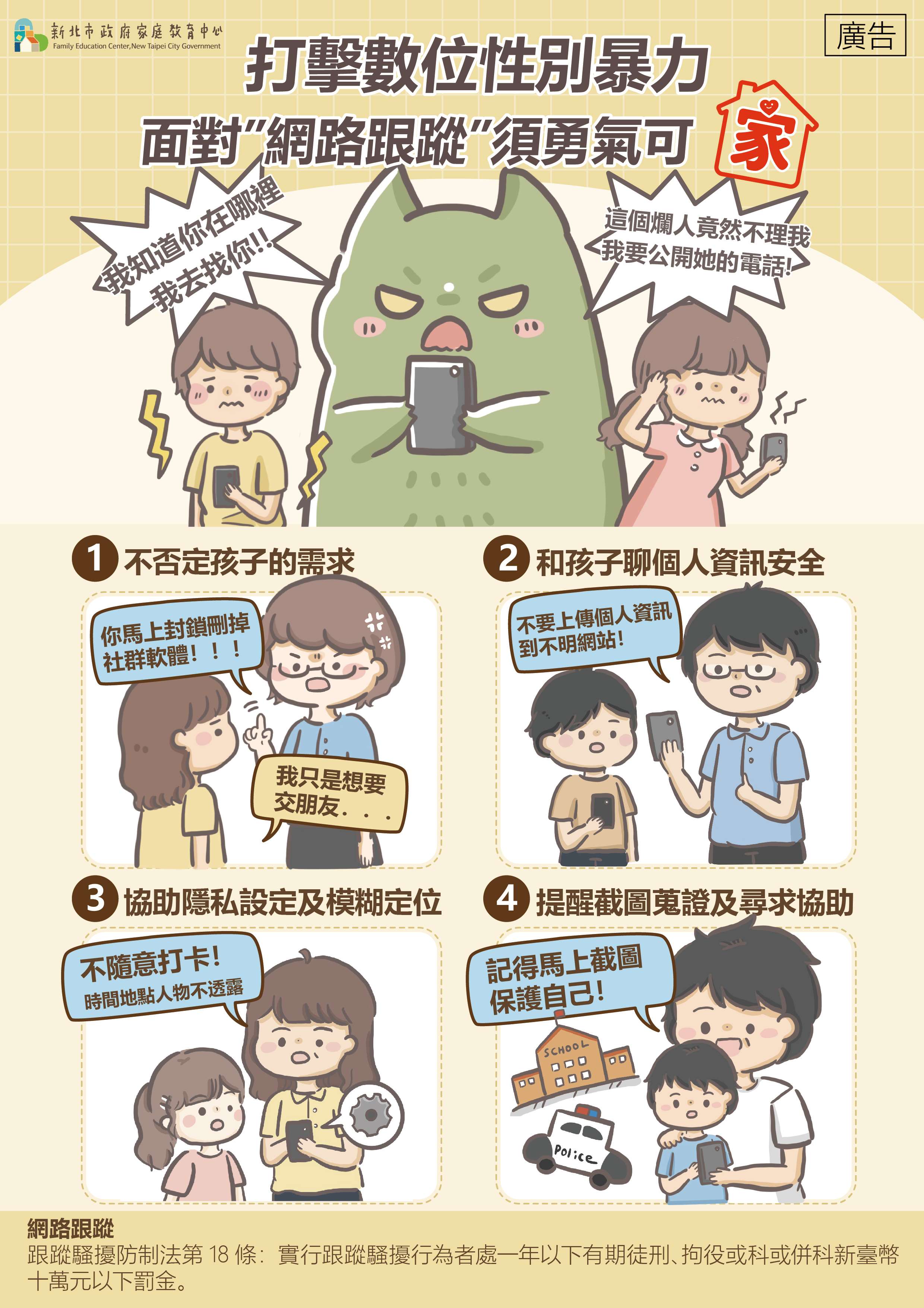 二、增進國人防治數位性別暴力意識,鼓勵家長陪伴孩子面對數位性別暴力,提供理解與幫助,並結合校園、家庭與社會力量,共同打造安全的網路環境。