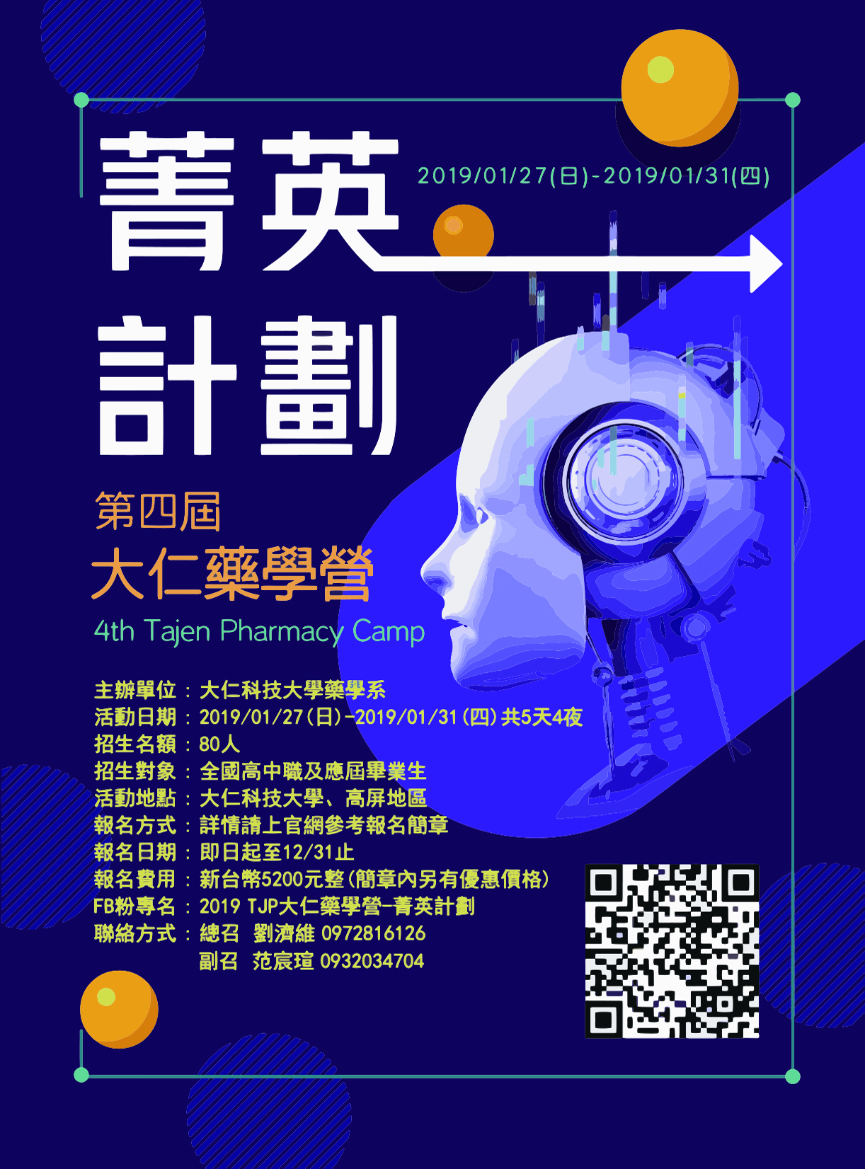 三、活動日期:108年1月27日-31日。活動詳細內容請詳見「第四屆2019 TJP大仁藥學營-活動簡章」及第四屆2019 TJP大仁藥學營活動粉專,臉書搜尋:「2019 TJP大仁藥學營-菁英計畫」。
