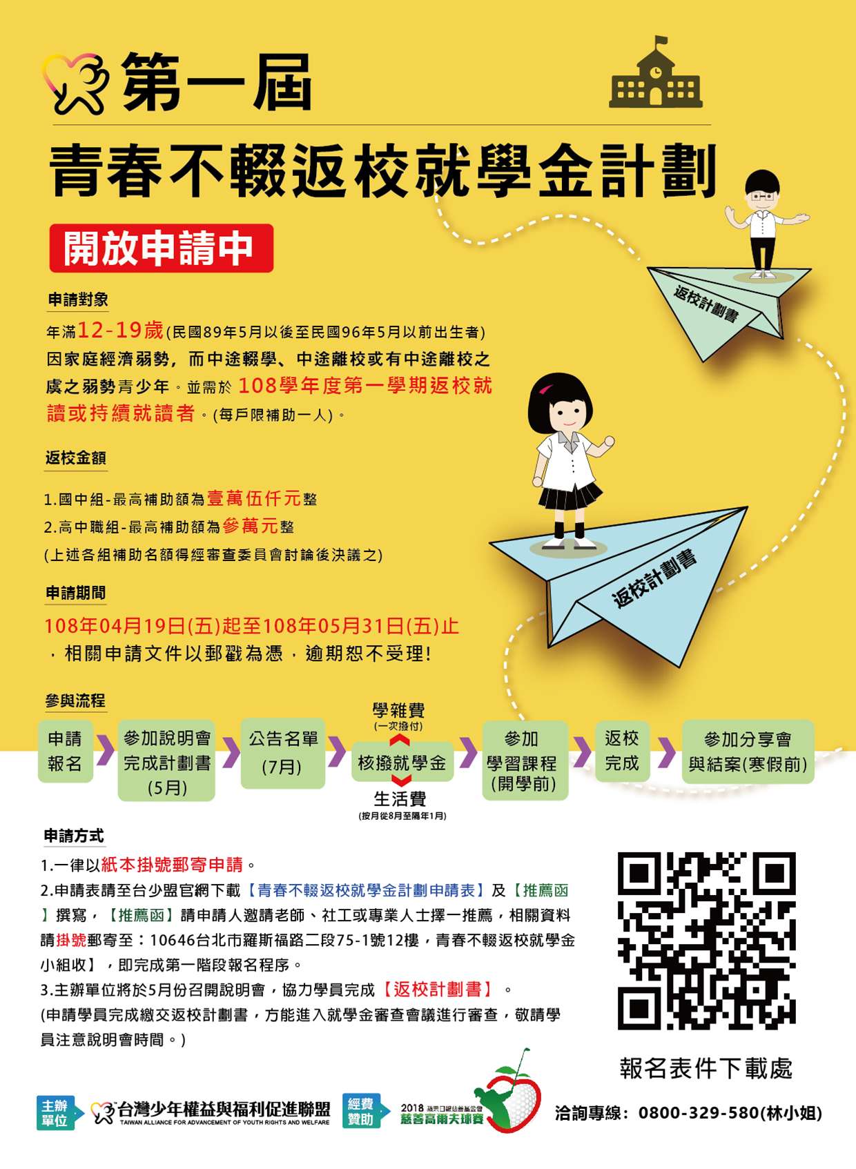 二、旨揭計畫申請對象為年滿12至19歲,因家庭經濟問題而暫時離校之國、高中職中途輟學或中途離校或中途離校之虞之學生,為助其早日返校完成學業,該聯盟特成立「青春不輟返校就學金計畫」,提供其返校期間所需之生活費及學雜費用。