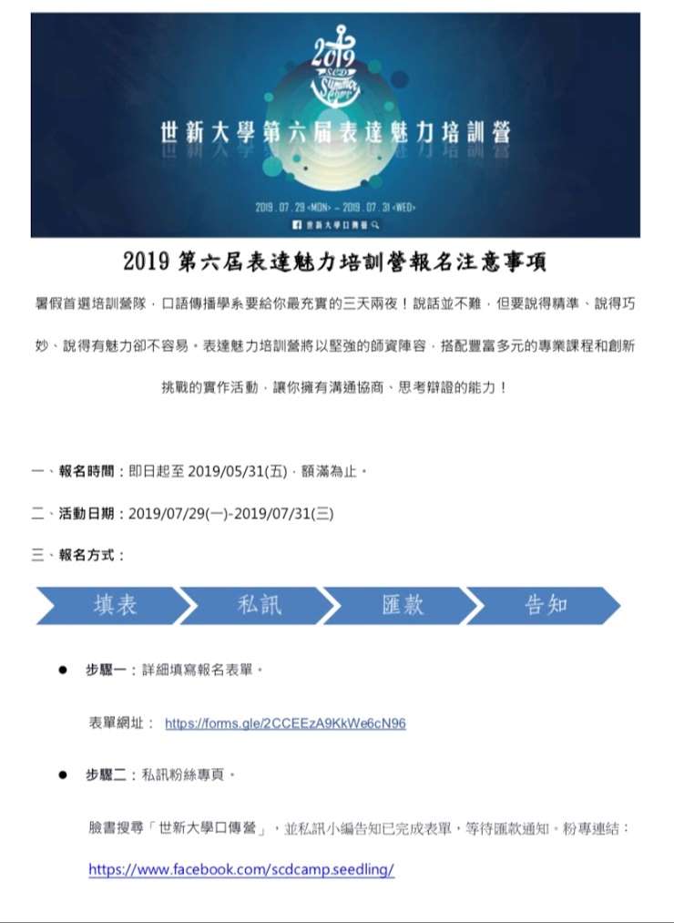 一、有鑑於溝通已成為許多職業必備技能,本校口語傳播學系將於108年7月29日至31日舉辦3天2夜暑期口傳營,藉以增進學生口語表達能力,更透過營隊參與實際體驗口語傳播技巧的應用,提升學生溝通協調能力。