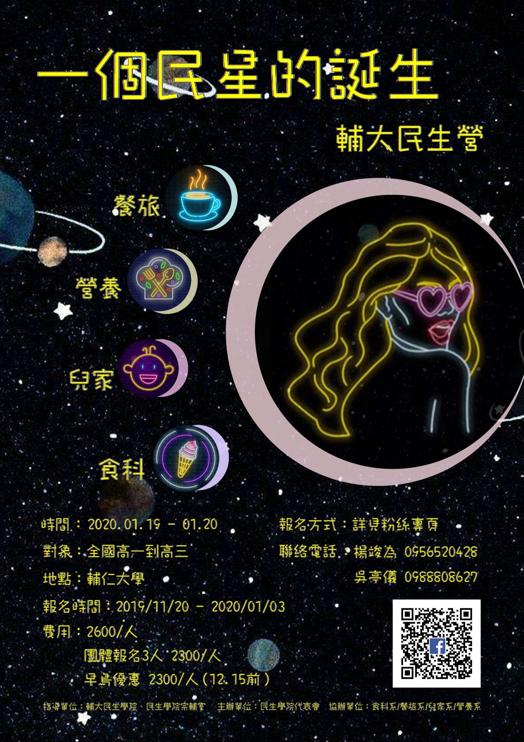 二、營隊日期:109年1月19日(星期日)~1月20日(星期一);報名時間:即日起至109年1月3日止;活動地點:本校民生學院。