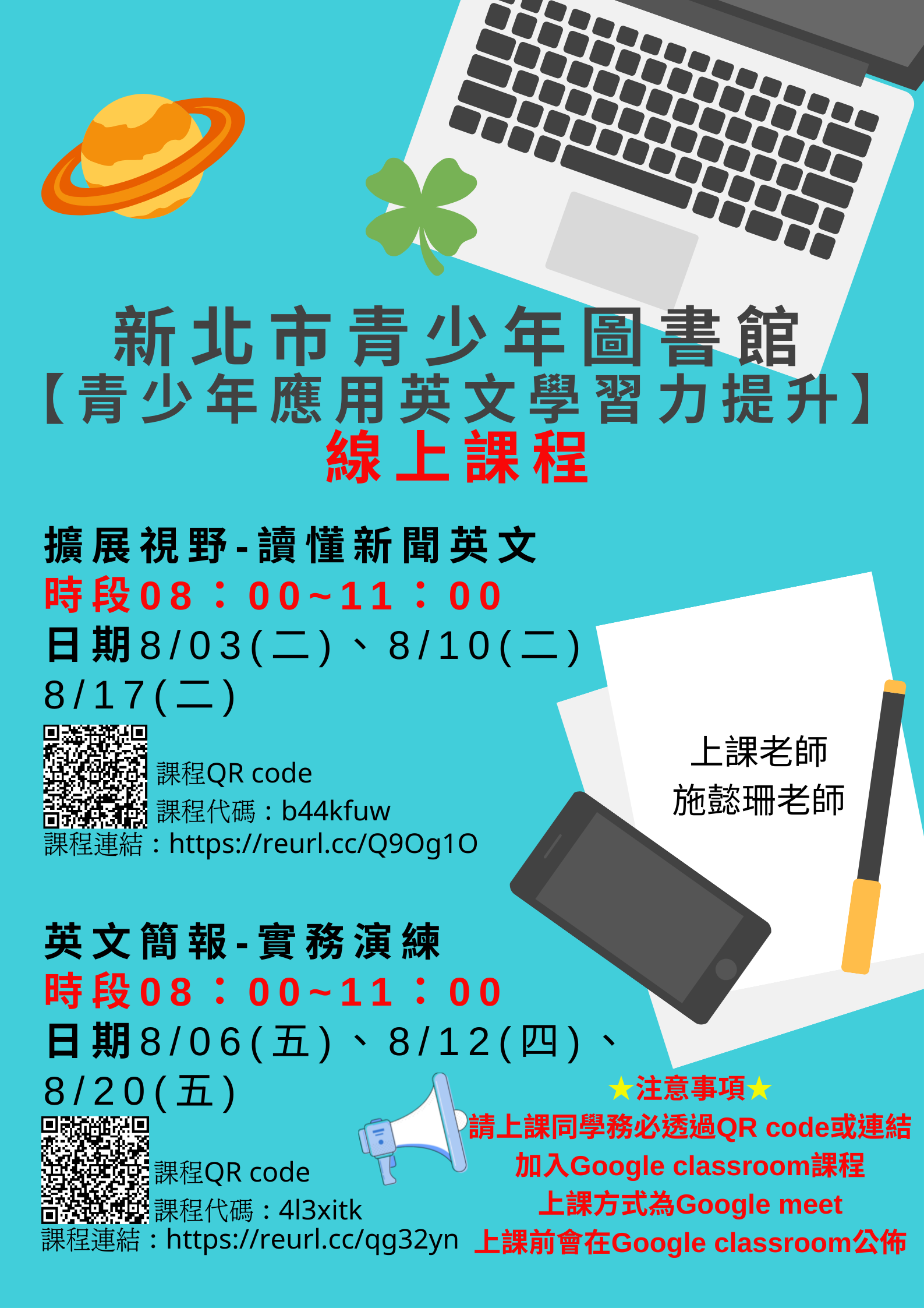 為協助青少年面對新課綱,鼓勵養成自主學習習慣,及透過資訊科技啟發創造力,特辦理「青少年應用英文學習力提升計畫」及「108 課綱啟航計畫-青少年小論文寫作」等活動,歡迎學校師生踴躍報名參與。