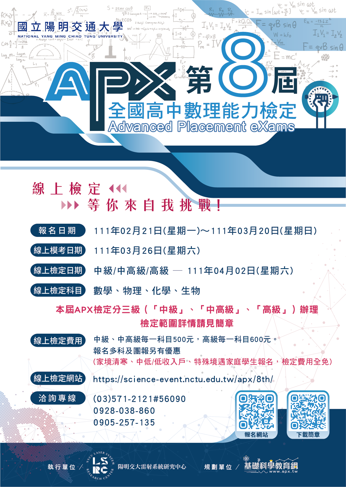 十二、檢附第八屆活動海報供參(附件二)。詳細內容請至國立陽明交通大學APX報名網站http://science-event.nctu.edu.tw/查詢、報名,或洽APX檢定聯絡窗口:0905-257-135,(03)571-2121#56090。