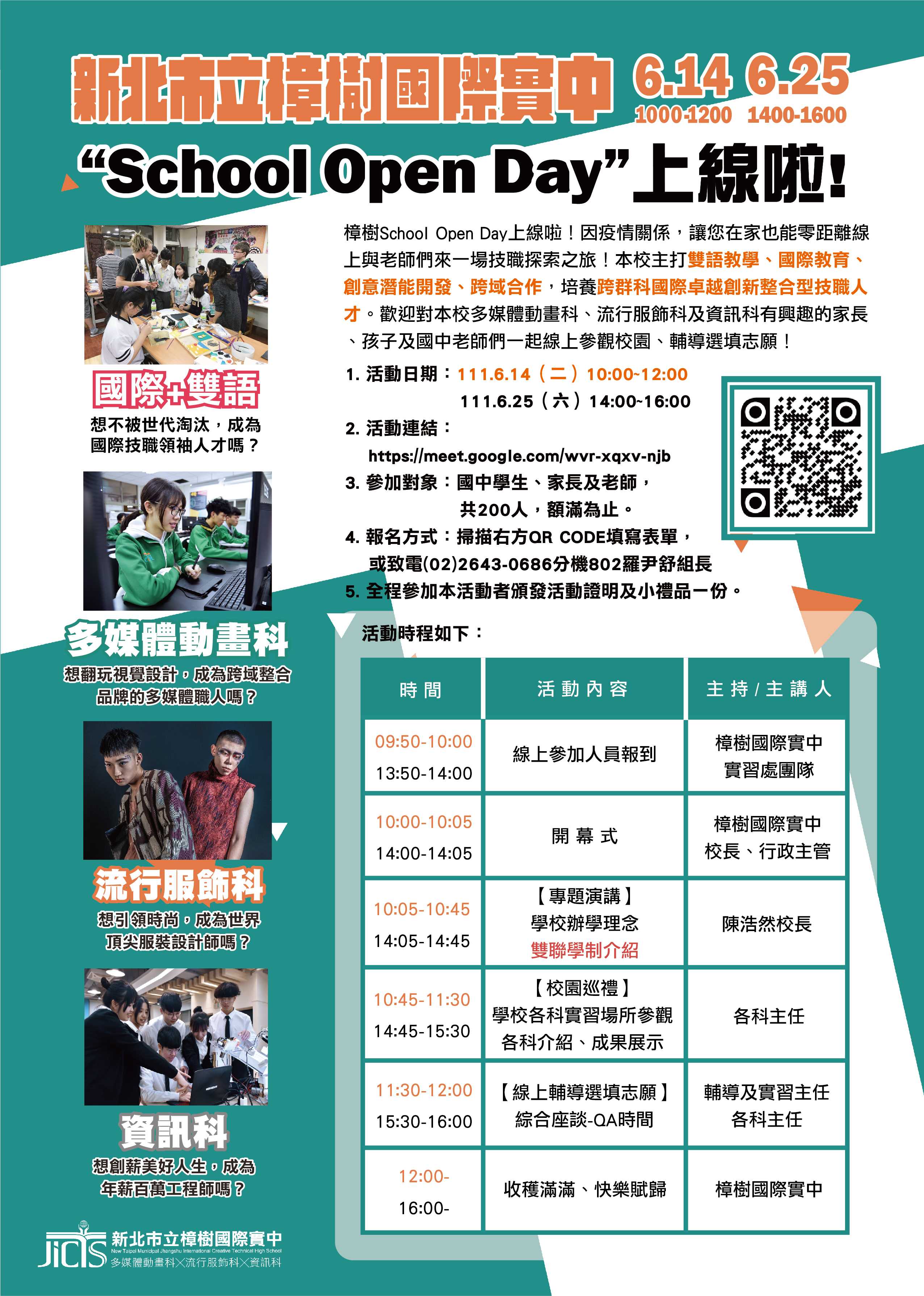 樟樹School Open Day上線啦!因疫情關係,讓您在家也能零距離線上與老師們來一場技職探索之旅!本校主打雙語教學、國際教育、創意潛能開發、跨域合作,培養跨群科國際卓越創新整合型技職人才。歡迎對本校多媒體動畫科、流行服飾科及資訊科有興趣的家長、孩子及國中老師們一起線上參觀校園、輔導選填志願!!