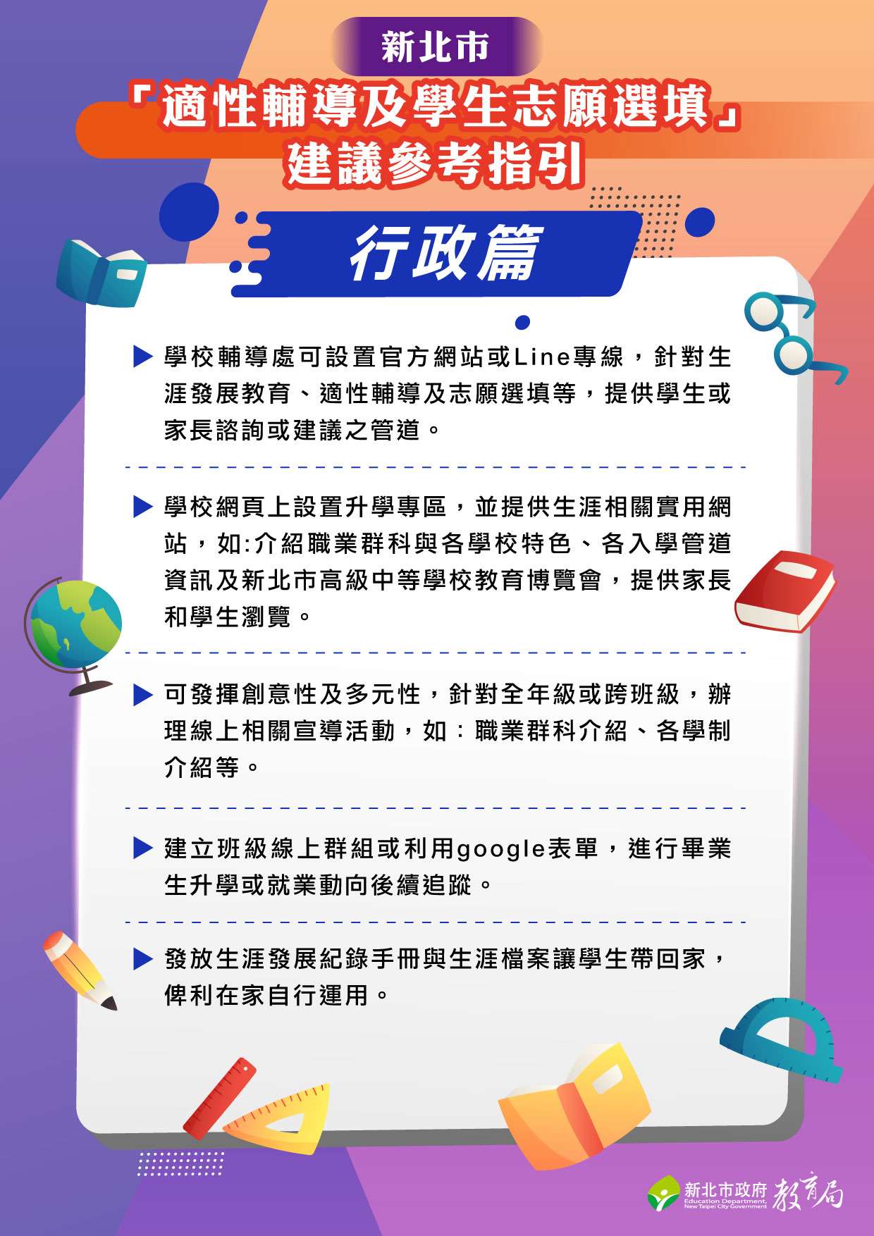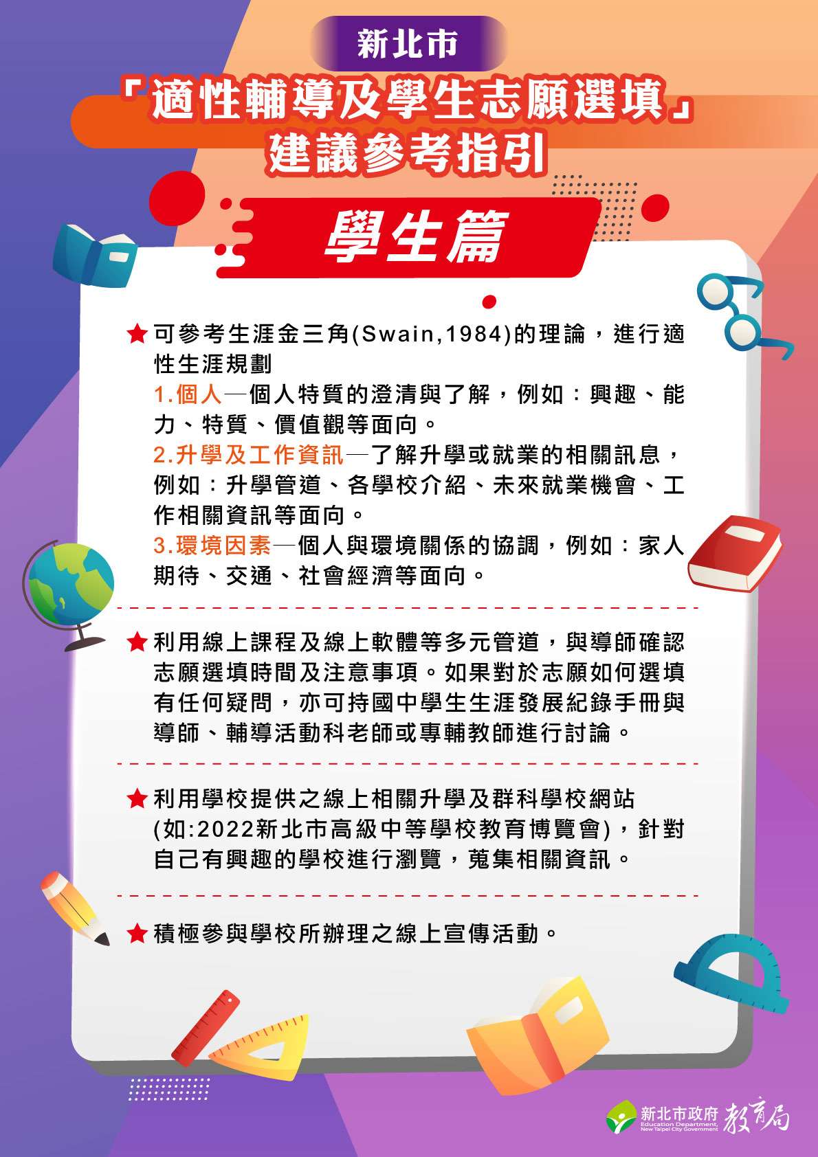 二、「適性輔導及學生志願選填」建議參考指引:共分成導師篇、輔導活動科教師篇、專輔教師篇、行政篇及學生篇等共5部分,並製作成圖卡供參。