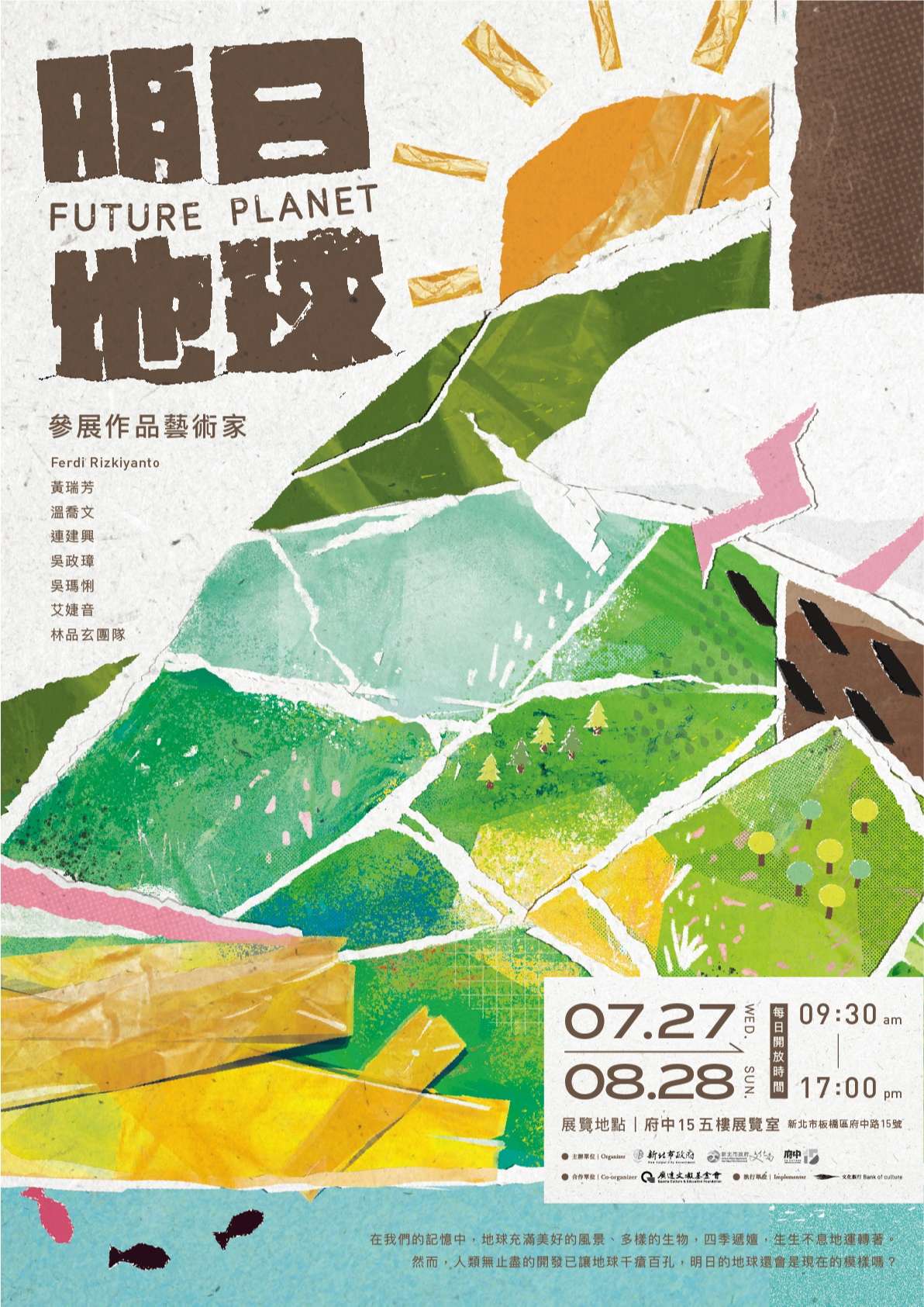 一、府中15與財團法人廣達文教基金會合作辦理「明日地球」環境藝術特展,結合科技、影像等互動方式,展出「游於藝」計畫中「遇見大未來」系列畫作,以促進民眾對於全球暖化和氣候變遷議題的重視,推廣環境永續議題。
