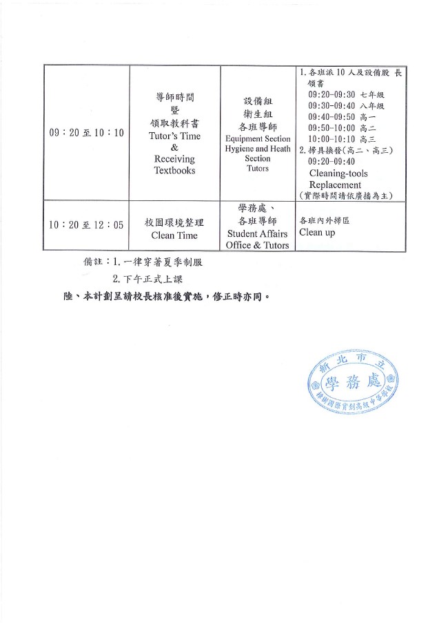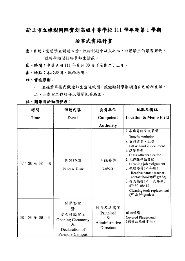 樟樹國際實中111學年度第1學期『始業式實施計畫』,請自行下載參閱。