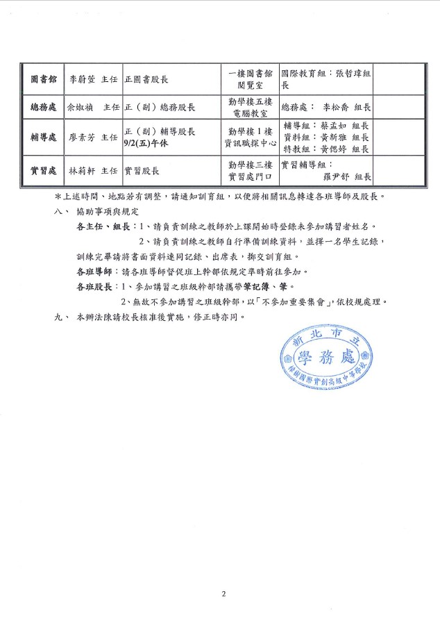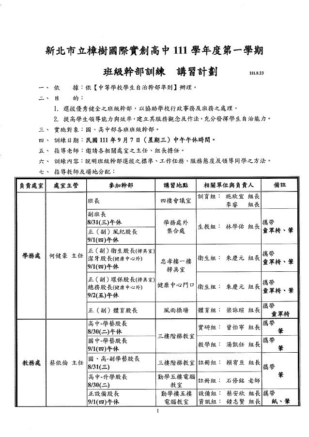 樟樹國際實中111學年度第1學期『幹部訓練計畫』,各幹部訓練時間略有不同,請務必詳閱~~