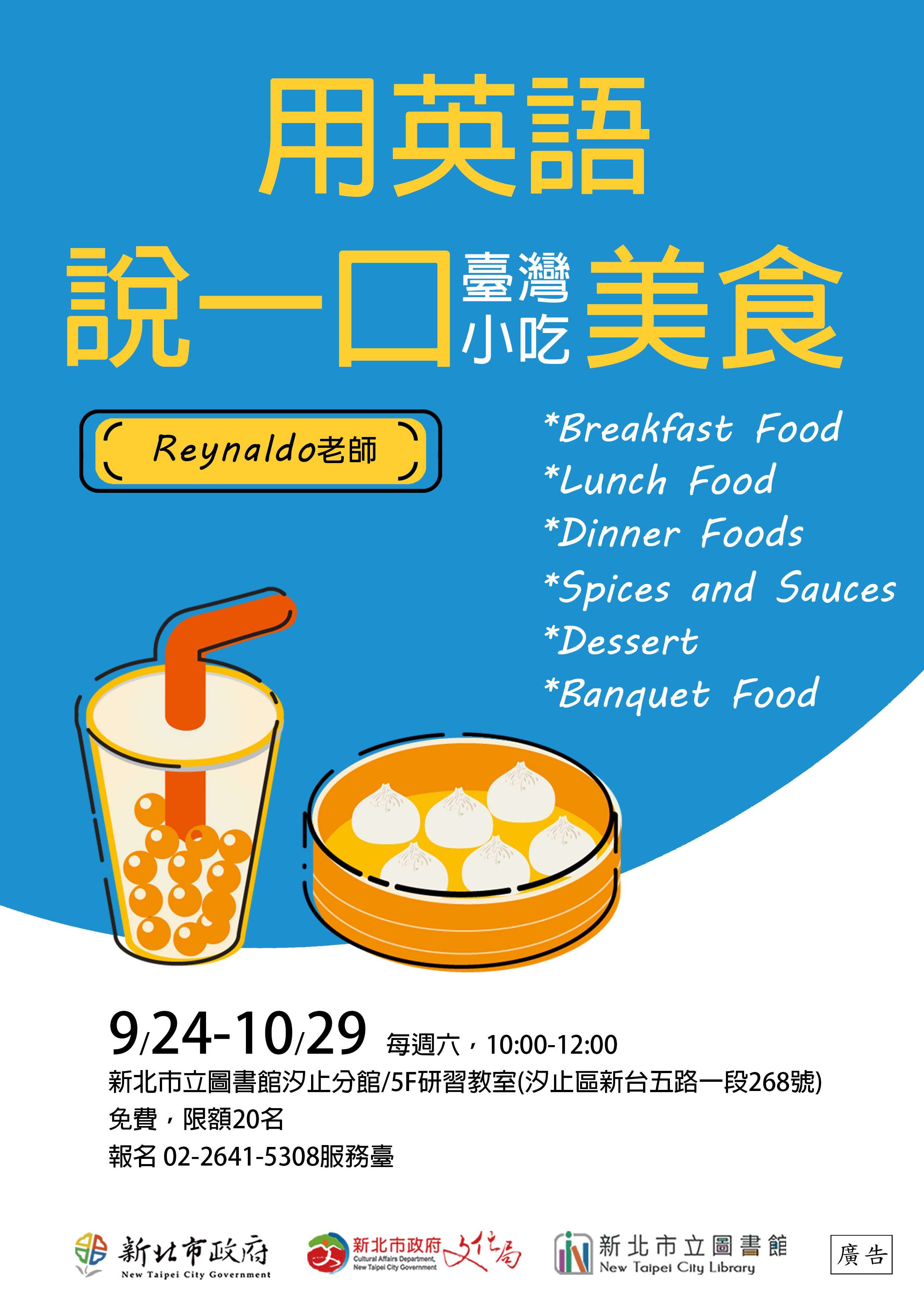 一、臺灣是美食王國,許多外國媒體都會到臺灣來報導、評選臺灣美食,特別是小吃,小吃類的食物不論海內外,讓所有人都為之瘋狂。本館汐止分館邀請在臺居住超過15年的外籍美語教師Reynaldo,採單元性主題分享教授臺灣小吃的常用英文單字和用法、說法。