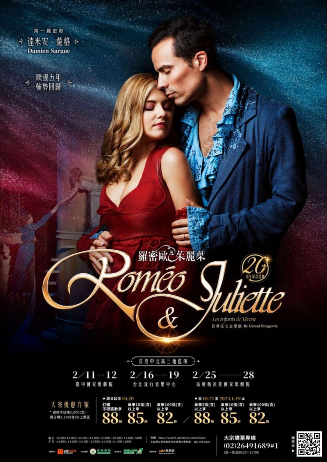 (三)、表演介紹:改編自英國文豪莎士比亞的經典作品「羅密歐與茱麗葉」,是當今唯一用「音樂劇」及「法文」形式來呈現這不朽愛情故事的創作。經典故事、融合流行及古典風格的動人歌曲,再加上高達2.5億製作費的華麗精緻服裝場景,於2001年巴黎首演後,歷經多年演出已被翻譯超過10多種語言版本,莎翁經典再次造成全球轟動!至今已累積全球超過650萬人次觀賞紀錄,奪得「21世紀最偉大的流行音樂劇」之美讚。不僅在戲劇成就上佳評如潮,劇中歌曲更登上各國排行榜冠軍,創下百萬張銷售紀錄,是您不容錯過的叫好叫座經典法文音樂劇。