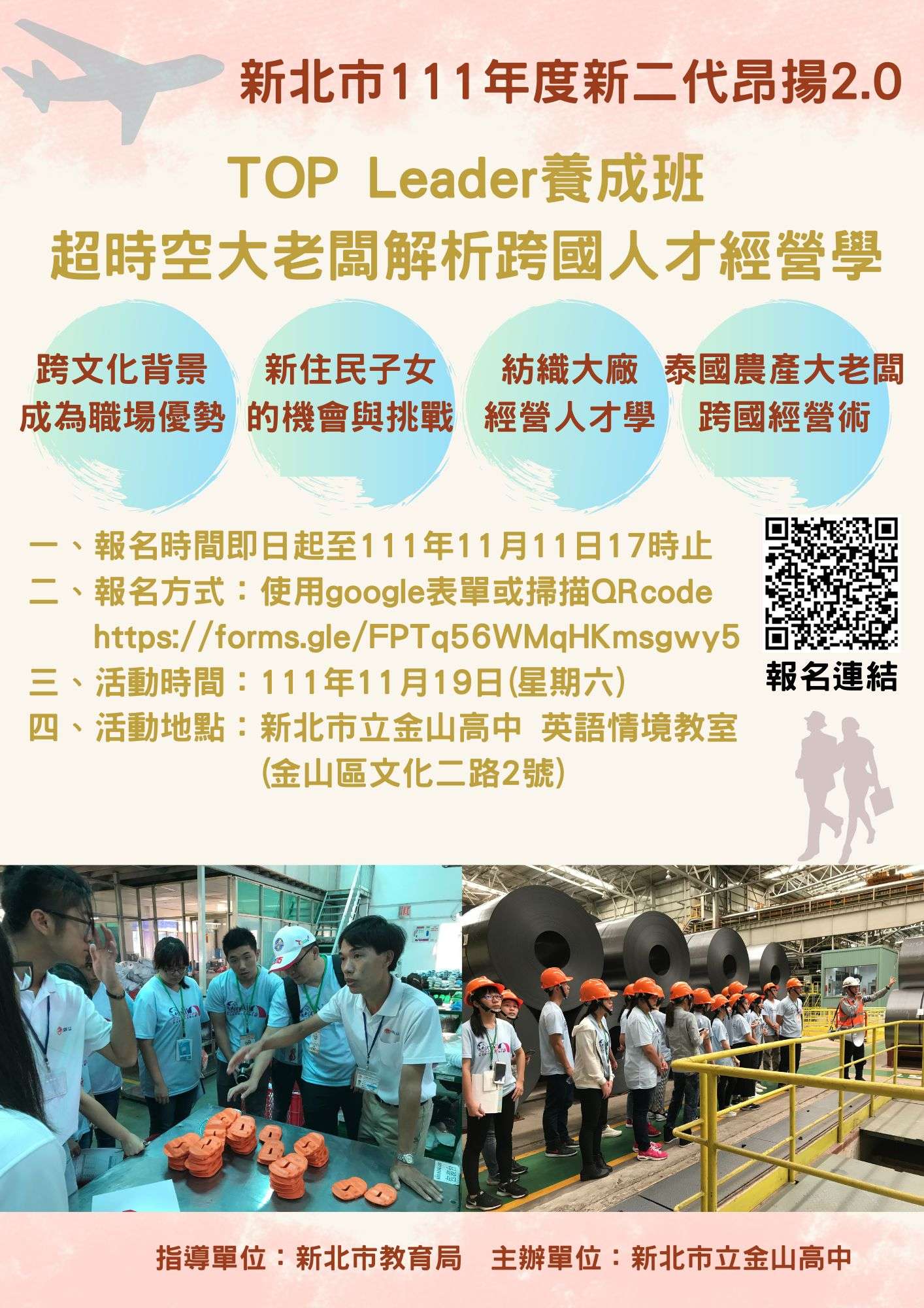 新北市111年度新二代昂揚2.0高中職學生職涯發展培力計畫--「TOP Leader養成班-超時空大老闆解析跨國人才經營學」,請學生踴躍報名參加。