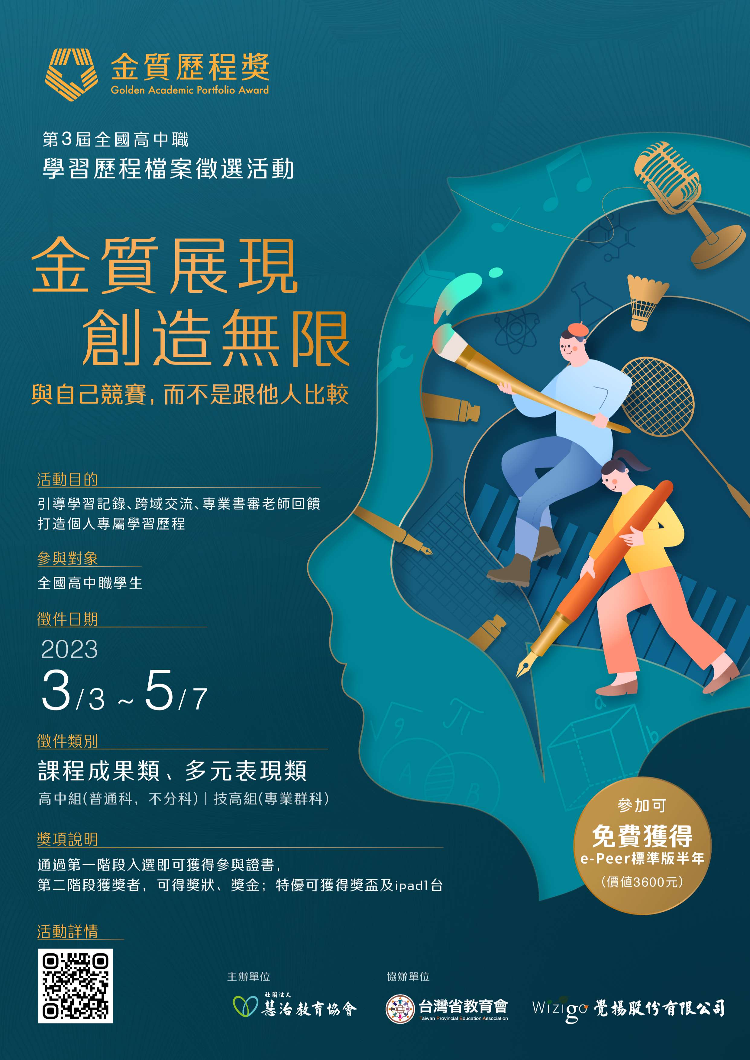 一、慧治教育協會以適性引導的理念推廣透過智慧科技工具【e-Peer 共學平台】讓學生能記錄學習軌跡,透過回顧統整學習、反思累積與轉變,肯 定自我、挑戰成為更好的自己。為了促進跨校交流,並提供學生展現自我的舞台,特舉辦全國高中職學習歷程檔案徵選活動【金質歷程獎】,鼓勵學生報名活動並上傳學習歷程檔案,除了可獲得書審老師給予的實質回饋,更了解學習歷程檔案製作的重點之外,獲獎學生也有機會受邀公開分享作品成果,培養邏輯思考及口語表達能力,奠定自主學習的基 礎。歡迎貴校教師鼓勵學生報名參加,也可透過 e-Peer 共學平台引導統整學習故事,將學習經驗打造成金質歷程!