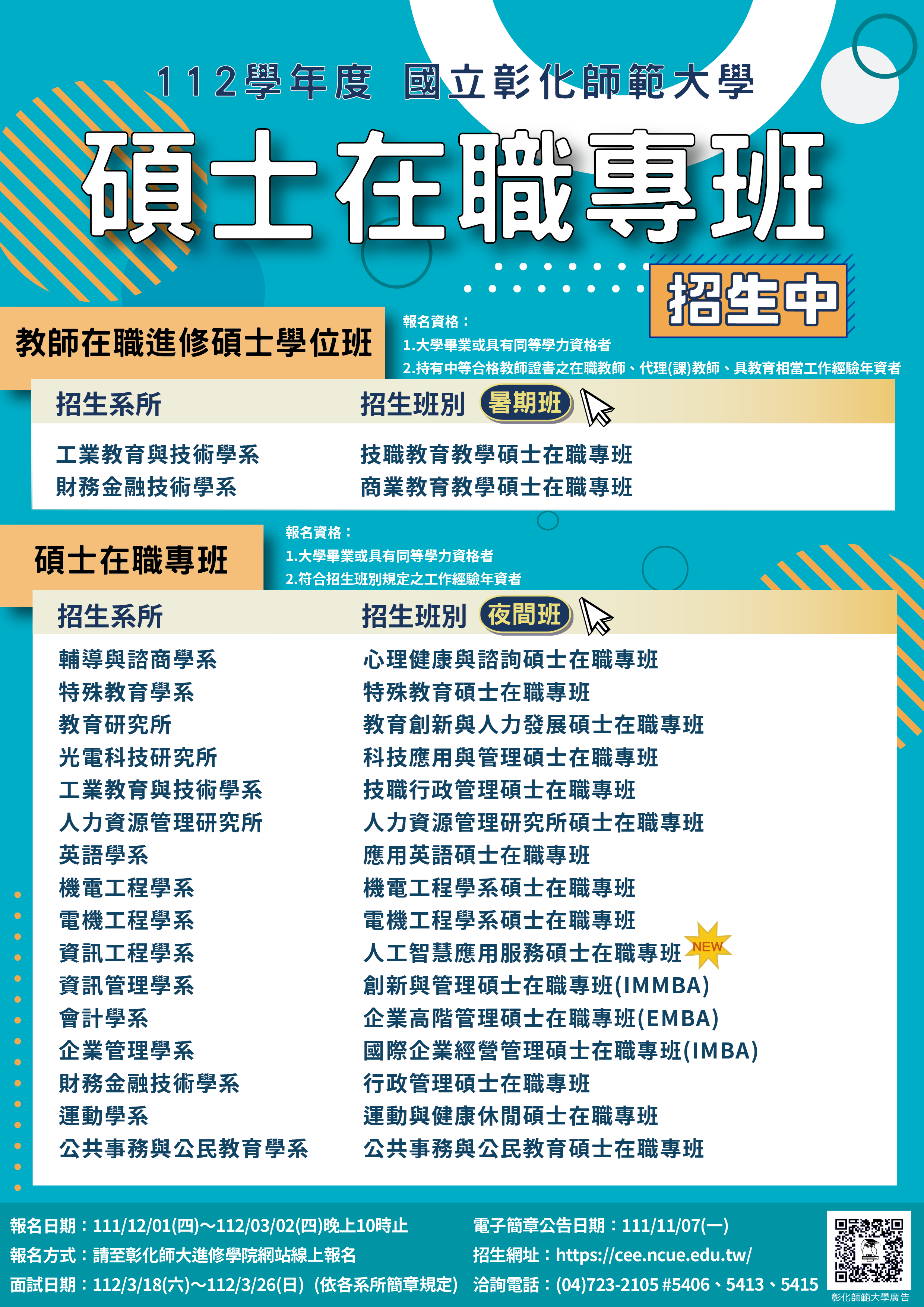 五、本招生資訊敬請協助公告於貴機關LED字幕機(跑馬燈)或電視牆,公告內容:「112學年度國立彰化師範大學碩士在職專班招生中,報名自111年12月1日起至112年3月2日晚上10時止,更多招生訊息請至彰化師大進修學院官網查詢」。