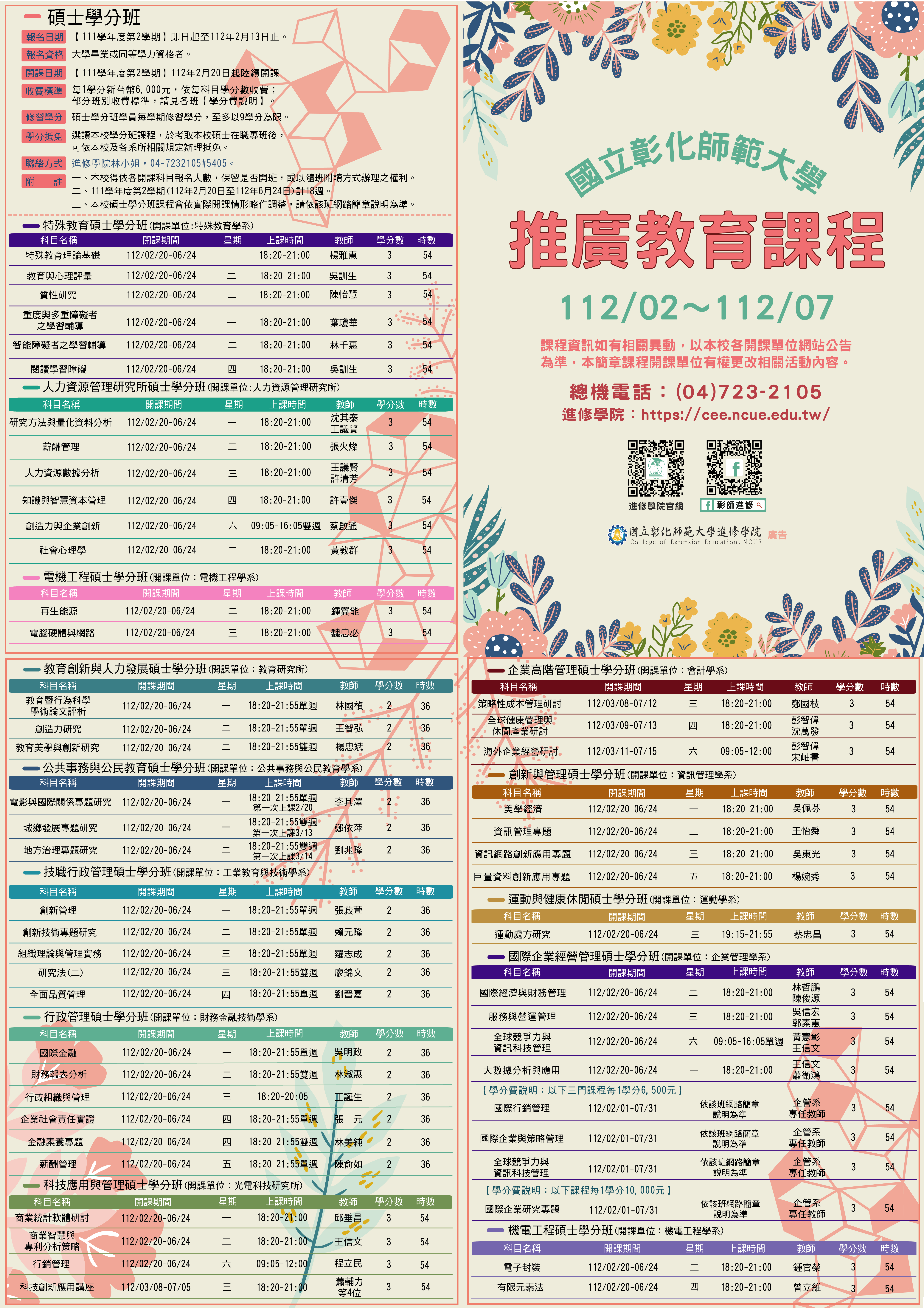 二、開課時間:112年2月至7月,各課程詳細上課時間請參見招生簡章,或至本校進修學院官網查詢(https://cee.ncue.edu.tw/news_detail.php?sn=506)。