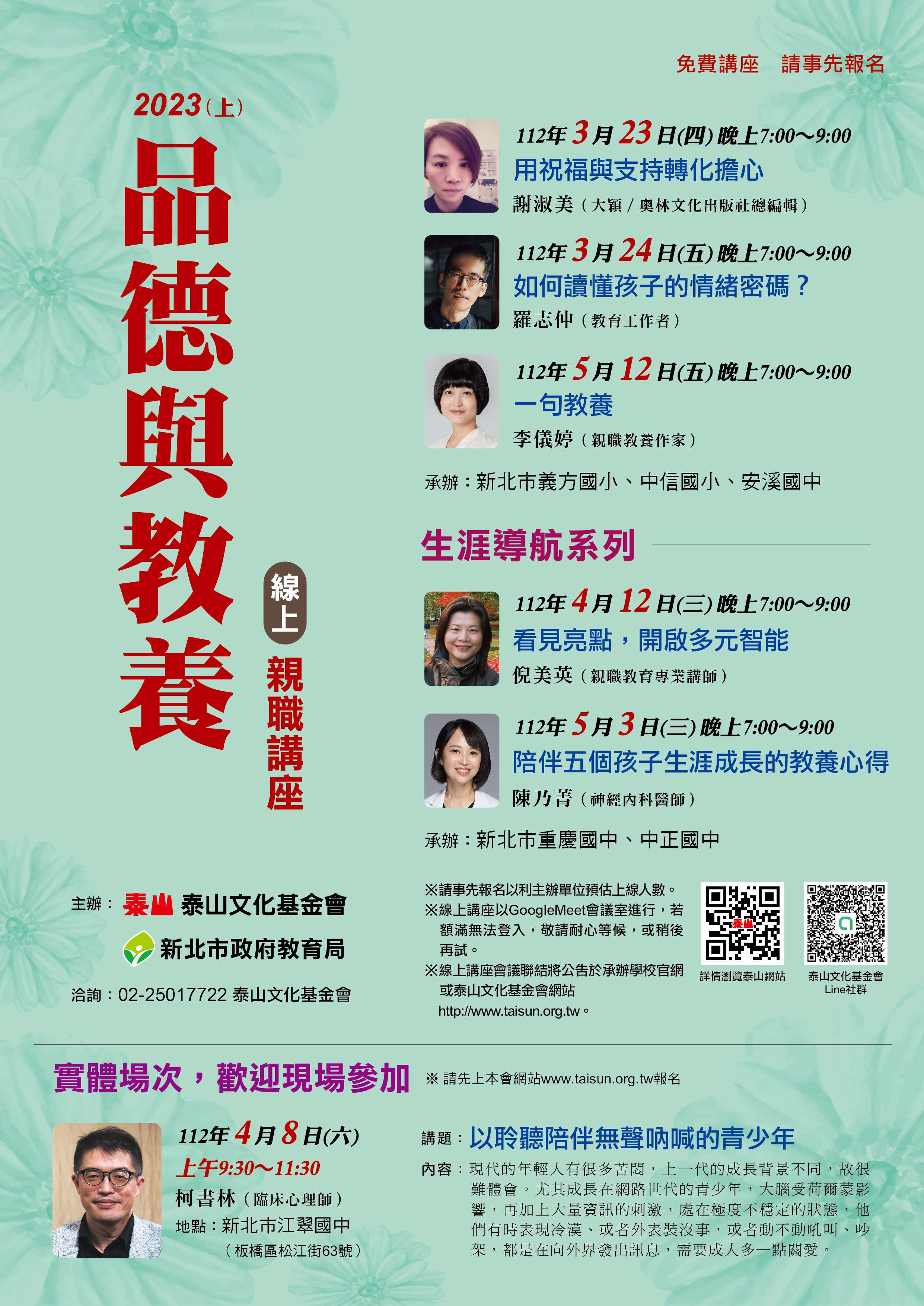 二、為強化親師對當代品德教育核心價值之認知與實踐力,落實品德教育行善之成效,本局與財團法人泰山文化基金會合作辦理旨揭講座場次及講題如下: