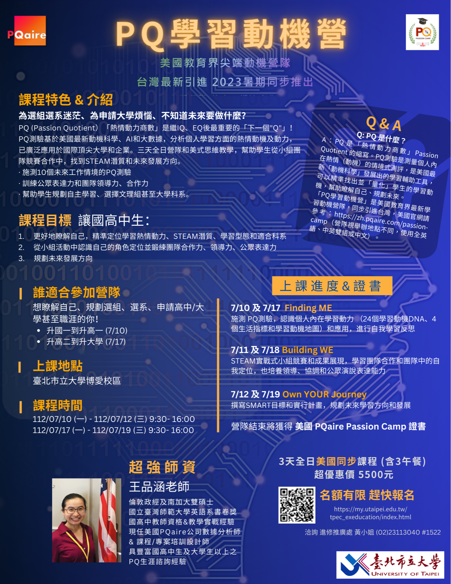 一、課程特色:PQ基於美國最新動機科學、AI和大數據分析個人學習熱情動力,已廣泛應用於國際頂尖大學和企業。三天全日營隊和美式思維教學,幫助學生從小組團隊競賽合作中,找到STEAM潛質和未來發展方向。