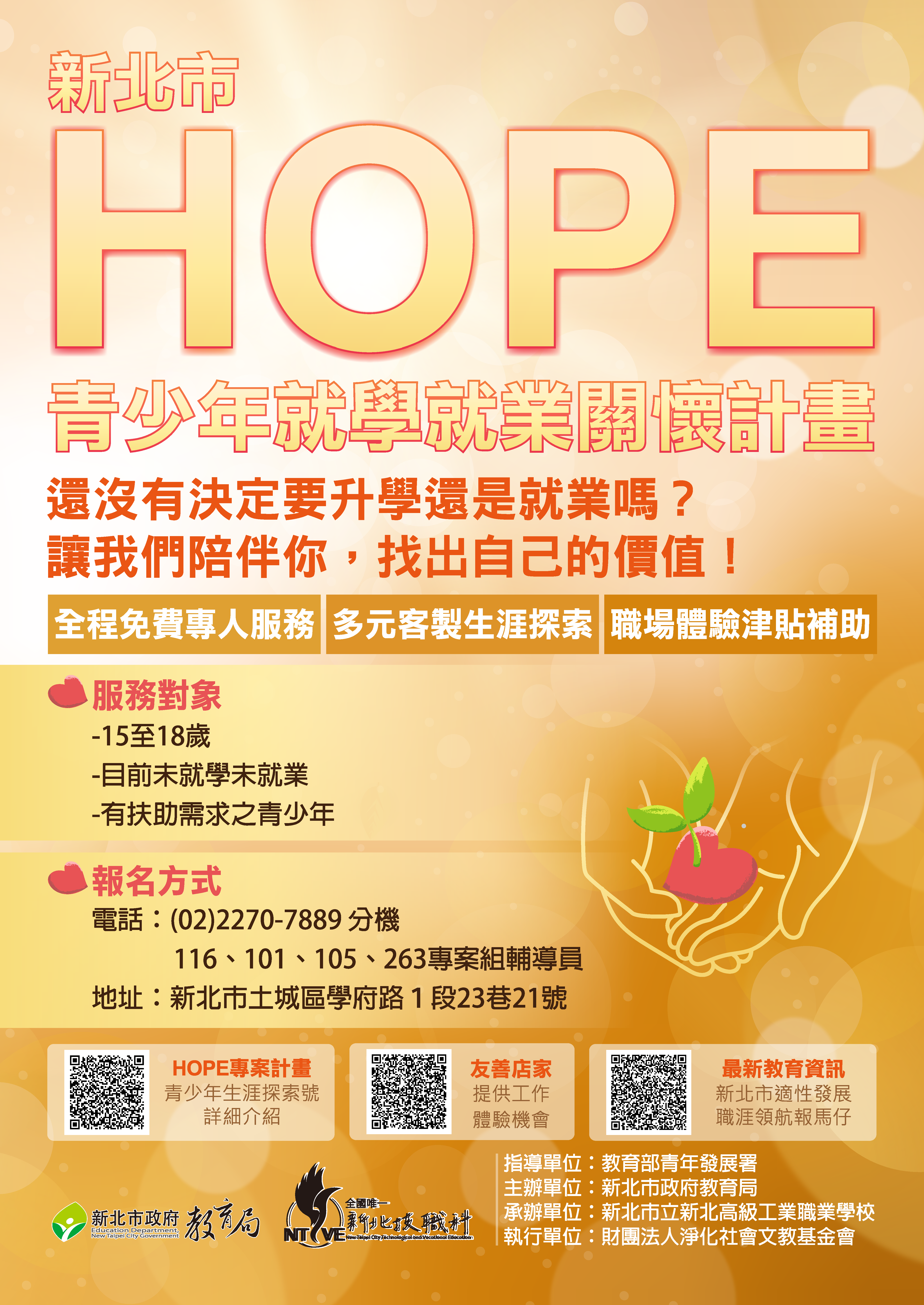 「用希望接住每個孩子」,為了讓每個國中畢業生未來無規劃升學及就業者、以及高中職中離生能有希望,新北市政府教育局規劃「新北市HOPE青少年就學就業關懷計畫」,服務對象: