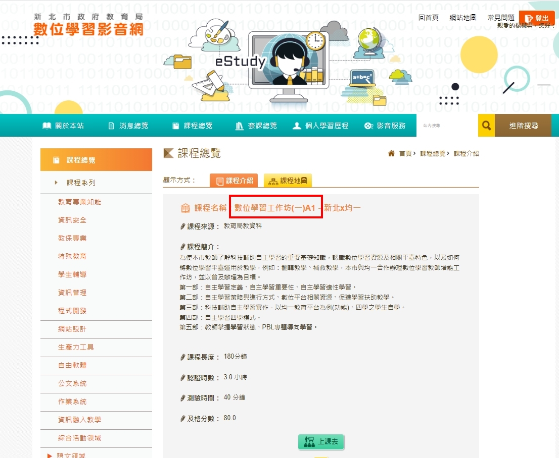 為方便本市教師參加研習,有關「數位精進教學A1」研習,新北市教育局已於「新北市數位學習影音網」提供線上課程,