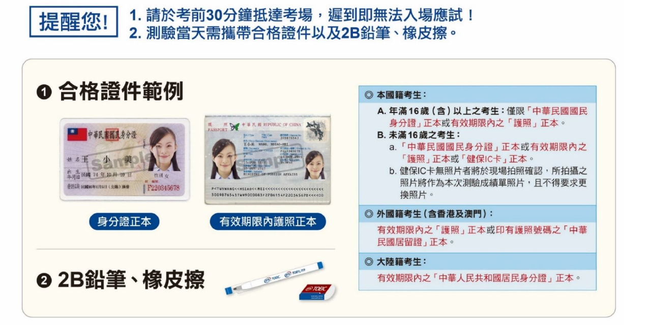 ■ 本國籍滿16(含)歲之考生:僅限身分證正本或有效期限內之護照正本入場