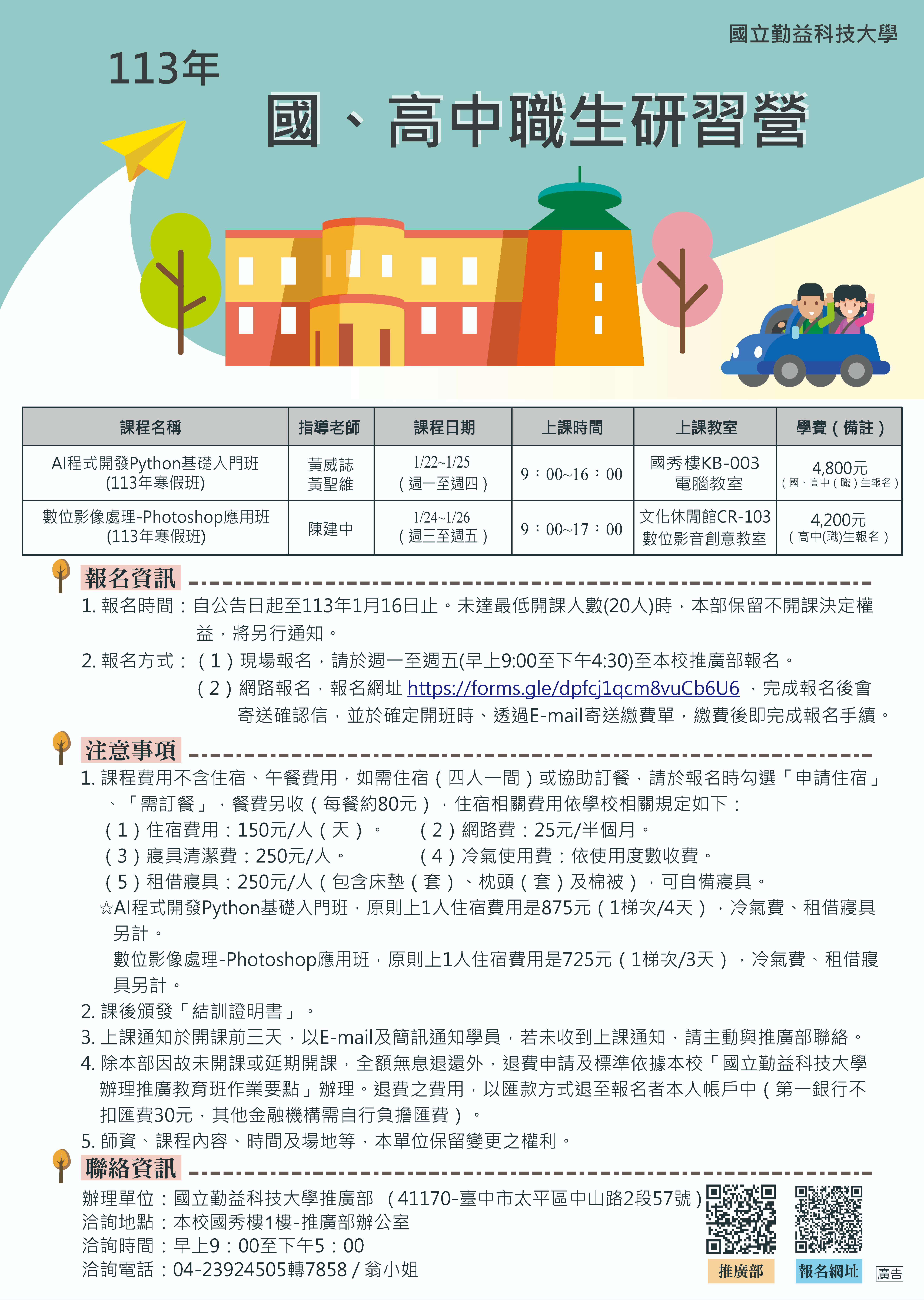 「AI 程式開發python 基礎入門班(113年寒假班)」招生對象:國中學生(國一至國三學生)及高中職學生(高一至高三學生);「數位影像處理-Photoshop應用班(113年寒假班)」招生對象:高中職學生(高一至高三學生)。
