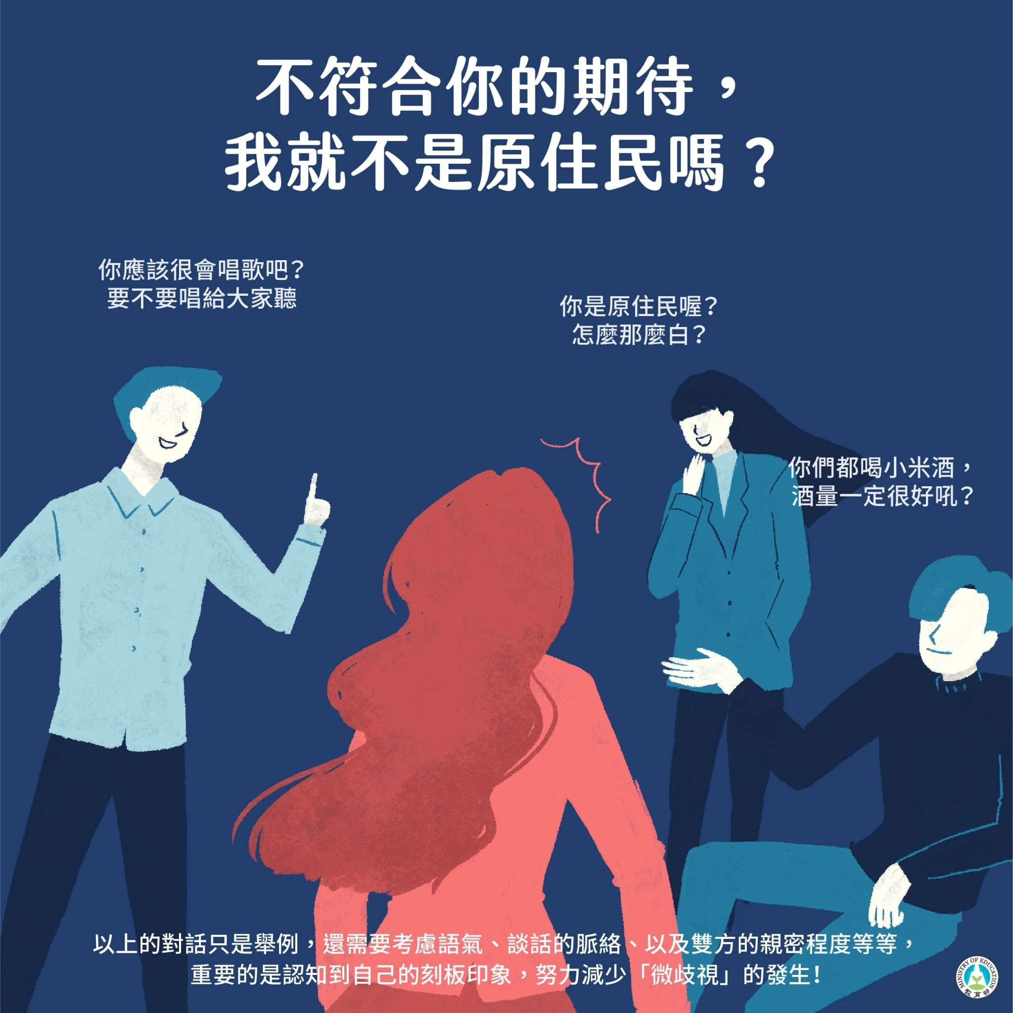 (三)隱微歧視(microaggression)前翻譯為微歧視,係為指日常生活中隱而未見的歧視之概念,提供教育部(https://www.facebook.com/405240086317285/posts/1711476352360312/)宣傳之內容供參(附件3、4)。