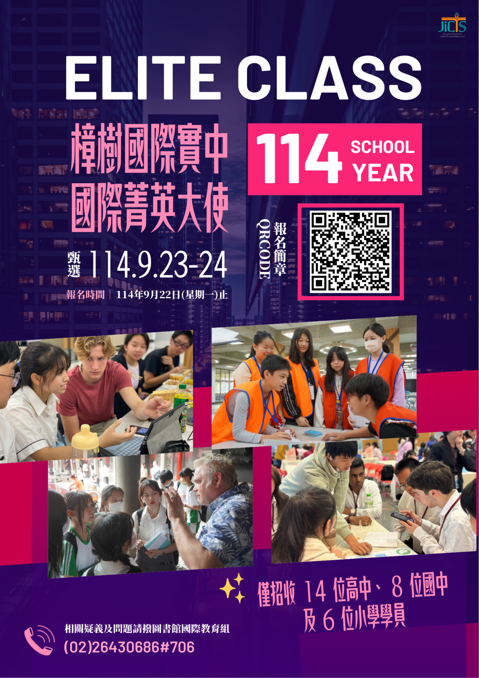114學年度國際菁英班招生簡章及報名表、招生海報如附件,請有意願報名的同學把握機會於時限內完成報名程序。